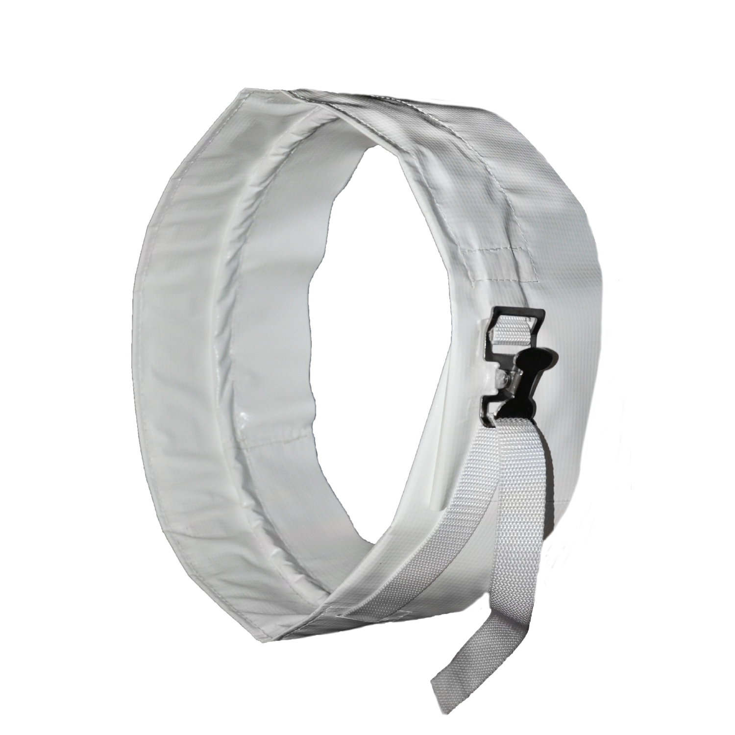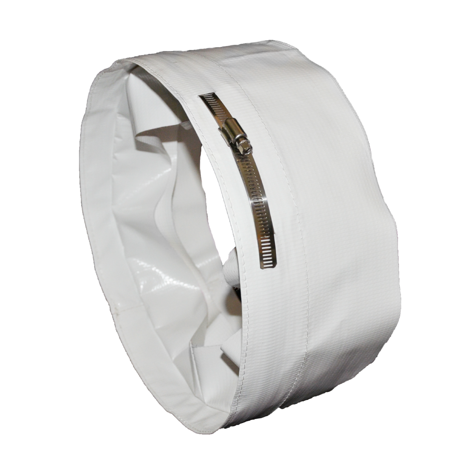 Worm-Gear Cuff consists of a stainless steel worm gear clamp enclosed in fabric. When the included screw is turned on the clamp, the metal band tightens around the duct. Our Worm-Gear Cuff includes an integrated clamp that allows an adjustable install onto a plenum, heater, or chiller for a strong and secure hold.