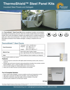 Our ThermoShield™ Steel Panel Kits deliver exceptional insulation and protection for portable and temporary structures. Each kit includes durable Structural Insulated Panels (SIPs) with polyurethane insulation and sealed joints for reliable resistance to water and wind in any environment. The system also features aluminum U-Channel Side Rails and Bottom-Panel Rubber Astragals, creating a complete all-in-one solution.